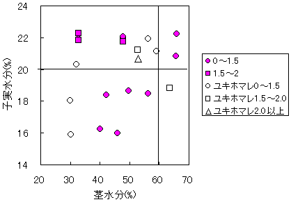 | 作物条件 | 茎水分 | 茎表面に「ぬめり」があるときはコンバインの収穫を止める。汎用コンバイン 茎水分55%以下で 汚れ指数2未満、豆用コンバイン 60%以下で汚れ指数1.5未満、水分が高いときは「高刈り」 を行い、汚粒発生の低減を心がける。 |