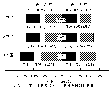 一方、前年の影響が残る春芽(平成13年)の粗収量は、7本区>5本区>3本区
