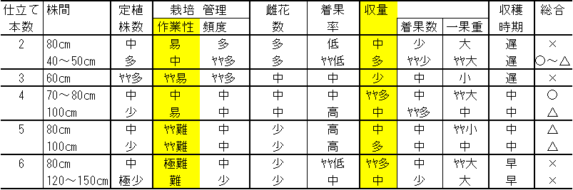 表2.仕立て本数・栽植密度と収量性、栽培管理特性