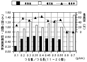 3) 草勢の1つの目安としてつる重/つる長比率と雌花数との関係を検討すると、比率0.3〜0.5で