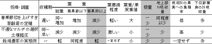 ①着果節位以上の葉重が軽い、②根量が少ない、③地上部窒素吸収量は同程度以下である