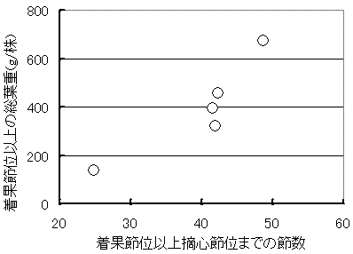 着果節位が高すぎること:着果節位が高いと摘心節位までの節数と葉重は減少する。