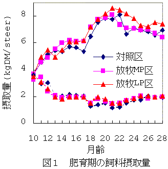 2)−1 肥育期間における乾物摂取量は、放牧した区の方が対照区より高く推移する傾向に