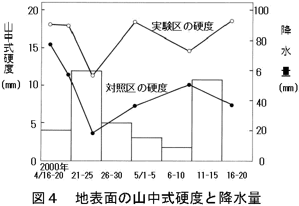 地表面の山中式硬度を測定した。山中式硬度は常に実験区で大きい値を示し,