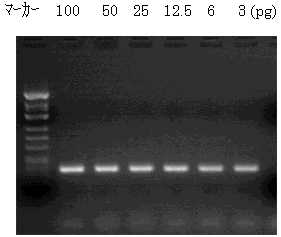 3)100pgから3pgまで階段希釈した牛白血球由来ゲノムDNAを用い、PCRに用いることのできる