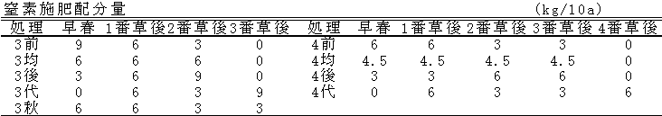 また、施肥量は当面オ−チャ−ドグラスに準ずることとし、施肥配分は早春および1、2番草後に等量とする。