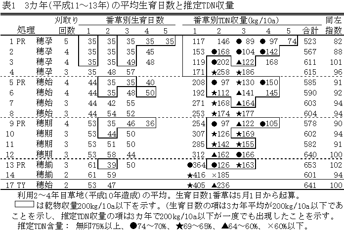 とし、1番草が出穂始めから出穂期、2番草は40〜50日後、3番草同50日後程度とするのが良かった。