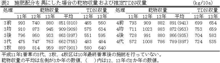 (2) 4回刈りの平均乾物収量は、均等施肥区、前期重点区、後期重点区>代替施肥区であった(表2)。