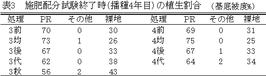 永続性(基底被度)は均等施肥区がやや優った(表3)。 IVDMDは均等施肥区がやや高かったが、