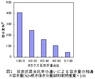 1)-1 オガクズに石炭灰を混合した場合、石炭灰の混合比率が高まるにしたがって容水量は