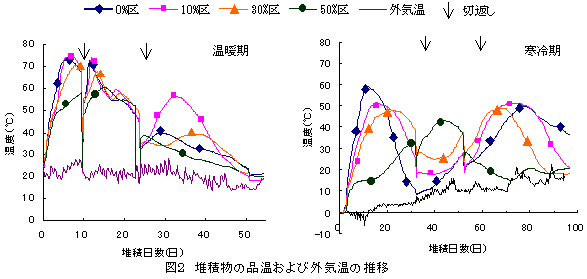 示したが、50%区では品温上昇および有機物分解がいずれも抑制された(図2)。