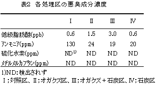3)-1 敷料として利用した場合、石炭灰はオガクズと同程度のアンモニア揮散の低減効果が認められた(表2)。
