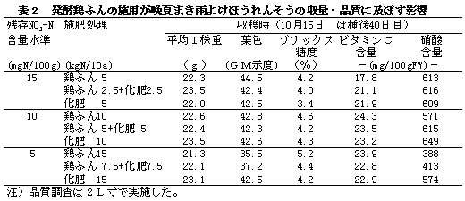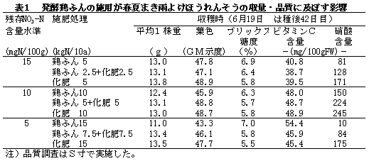 3)晩夏まき作型では、発酵鶏ふんの施用に伴い、ビタミンCを除く内部品質は向上した(表2)。