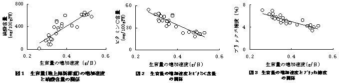 増加速度が遅くなるほど硝酸含量は低下し、逆にビタミンC含量及びブリックス糖度は増加した