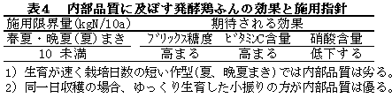 とりまとめ、表4に発酵鶏ふんが内部品質に及ぼす効果と施用指針を示した。