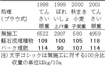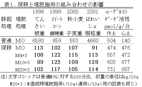 ①深耕:芽室町淡色黒ボク土で実施。1997年10月に堆肥(0,4,10,20t/10a)を散布後、30×1連プラウを