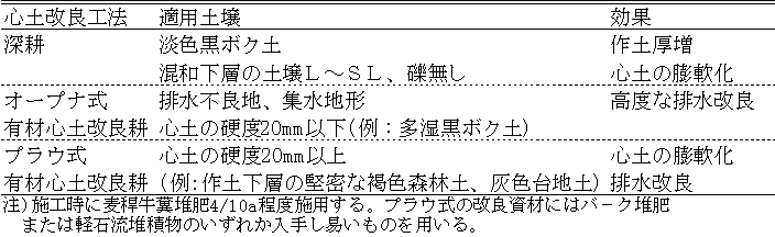 ことを目的に、深耕、オープナ式有材心土改良耕、プラウ式有材心土改良耕の3つの工法を