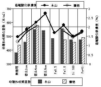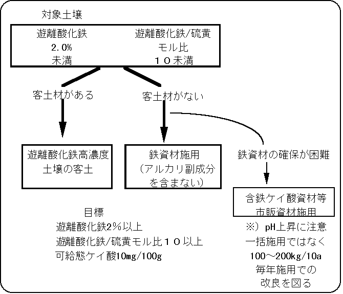 根圏土壌環境が必要である。この改善を目的として、遊離酸化鉄に富む土壌の客土および鉄・ケイ酸資材の