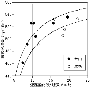 図4.土壌中の遊離酸化鉄/硫黄モル比と精玄米収量の関係(永山・鷹栖)
