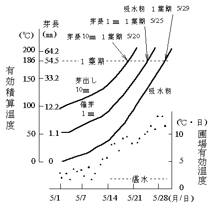 積の合計値で求められる。出穂期算出の起点になる「1葉期」までに必要な有効積算温度は