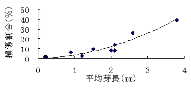 幼芽が長くなるにしたがって増加し、芽長が0.5〜1㎜以下であれば損傷割合はほぼ10%以下で、