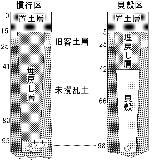 ○貝殻区:暗渠管を敷設後、掘削部を疎水材としての未破砕のホタテ貝殻で深さ40cmまで埋戻し、