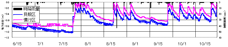 1) 貝殻区の暗渠排水線から2m以内の地下水位は慣行区よりも低く推移し、排水効果は高かった。