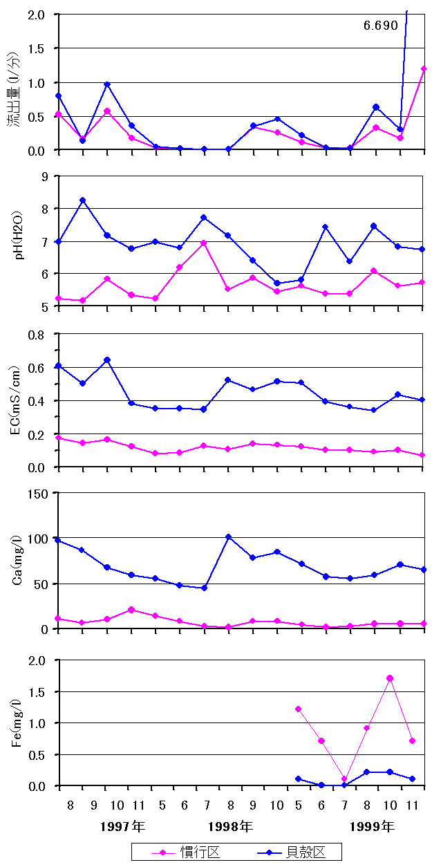 4) 貝殻区排水の鉄濃度が低いことから、貝殻を疎水材として用いる事により、鉄を主成分とする