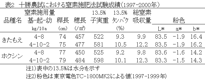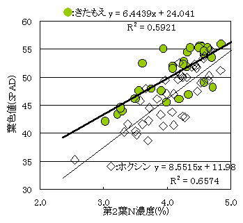 であり、「ホクシン」で提示された土壌診断に基づく窒素施肥量を適用できる(表2)。出穂揃い期の第2葉葉色値