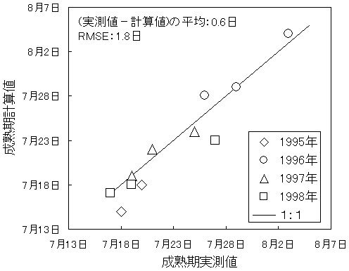 図1 各場奨励品種決定基本調査における成熟期と計算値の比較