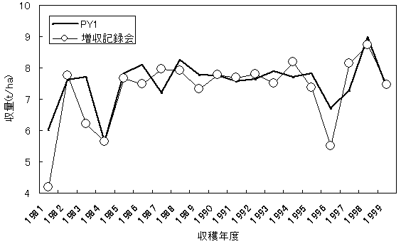 考慮しないポテンシャル収量(PY1)は、ほぼ同レベルであり、両者の年次変動パターンも良く