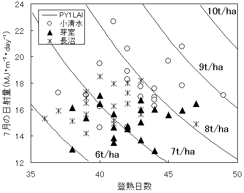 4)登熟日数・7月の日射量・最大LAIの3つの変数を用いる式によって、道内5地点における