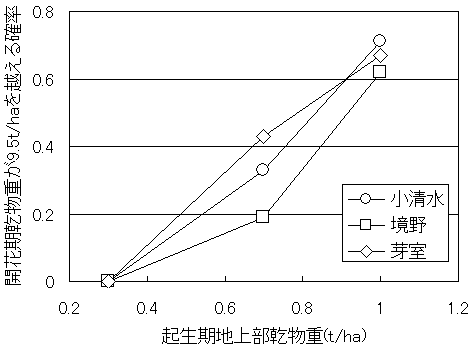 図4 起生期乾物重と、開花期乾物重が倒伏危険域を越える確率