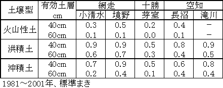 火山性土の場合で60cmの有効土層が必要である(表2)。