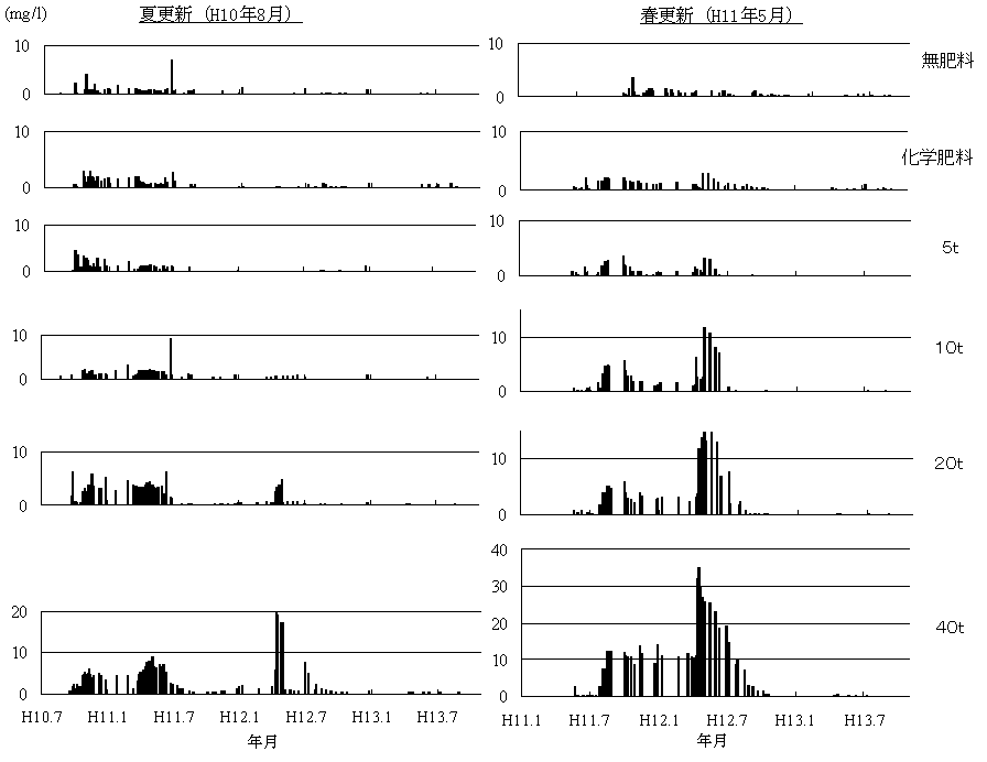 4)夏更新系列の40t区では3年目(平成12年)の融雪期に、硝酸態窒素濃度の最大値が20mg/lと