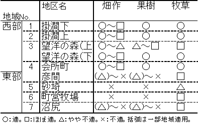 東部は草地主体の土地利用が適合する。畑作、果樹栽培には一部地域で防風対策や潅水が