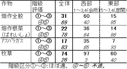 畑作全般60%、いも36%、アスパラガス35%であった。一方、東部では畑作適地が15%で、草地として