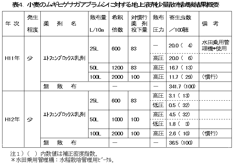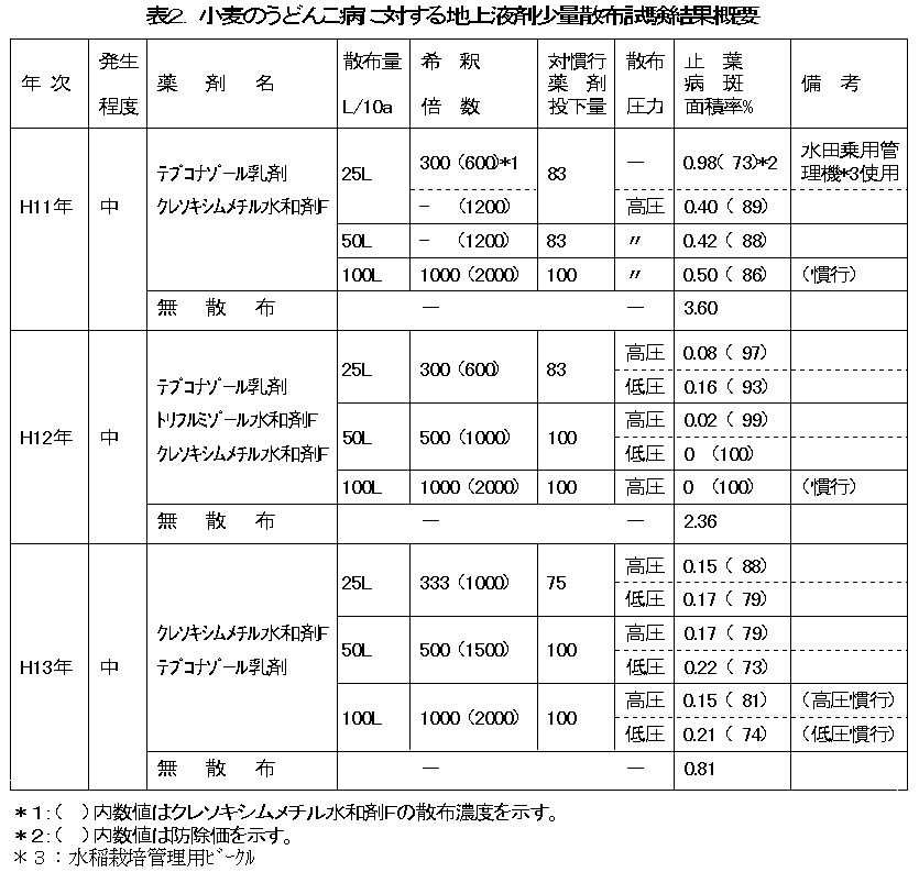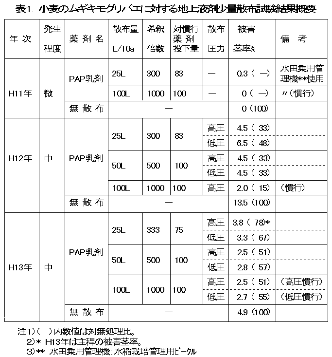 実用化が望まれている。そこで、小麦の主要病害虫に対する少量散布による防除効果を