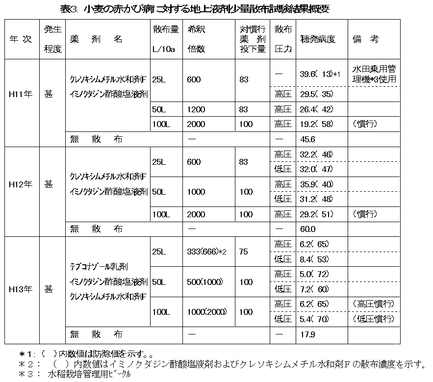 3)本試験に使用した薬剤は少量散布では未登録である。