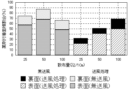 図1 散布量および送風処理の有無と株当たりの薬剤付着面積割合