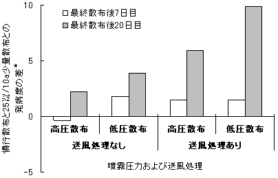 図2 マンゼブ水和剤の少量散布における噴霧圧力および送風処理の影響(平成13年:十勝農試)