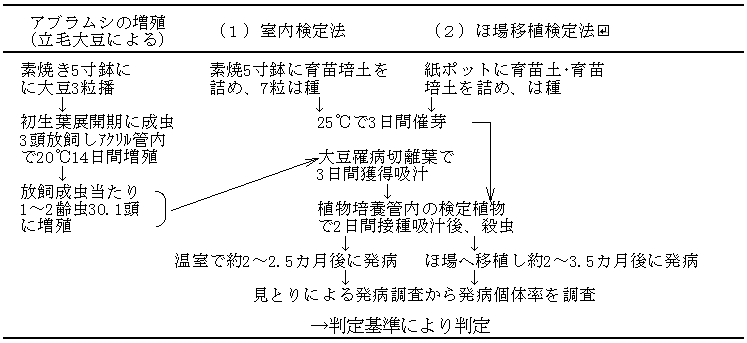 接種源としてジャガイモヒゲナガアブラムシおよびダイズわい化ウイルス黄化系統を用い、接種後は