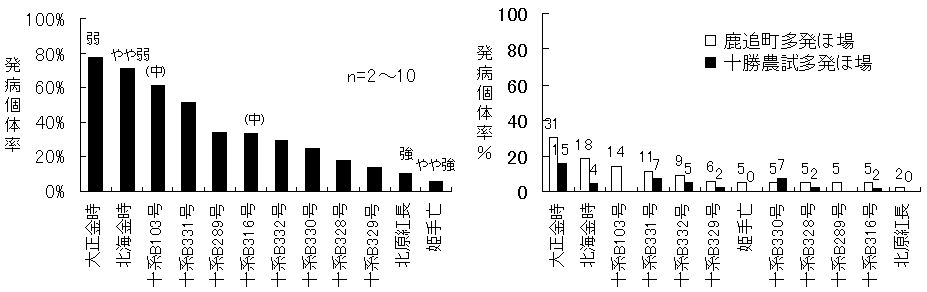 「姫手亡」(やや強)の発病個体率順位が逆転する事例が見られ、実態を反映しなかった。接種検定法は、