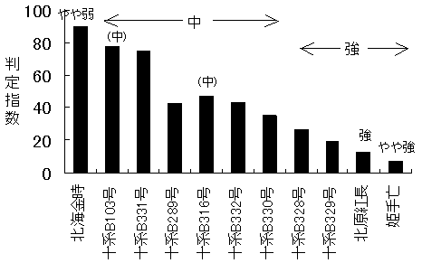発病個体率順列は検定ほの結果とおおよそ類似性がみられた(図1)。ただし、指標品種「北原紅長」(強)と