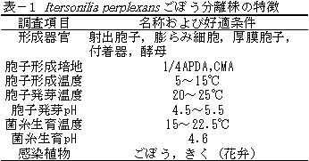 本病菌はごぼうの茎葉のみに黒条症状を示し,きくの花弁にも花枯症状を示す(表−1)。