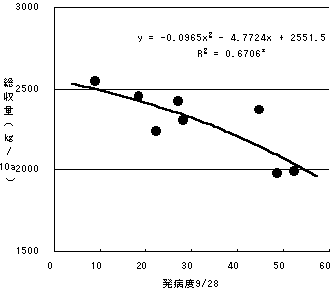 相関が得られた。発病度と総収量はy=−0.0965x2−4.7724x+2551.5(R2=0.6706)で,