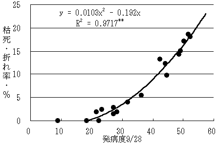 発病度と枯死・折れ率はy=−0.0103x2−0.192x(R2=0.9717)の関係式で示される(図−1,2)。