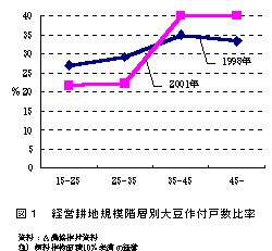 大豆を作付している経営の割合が低くなり、35〜45ha階層以上では高くなった(図1)。