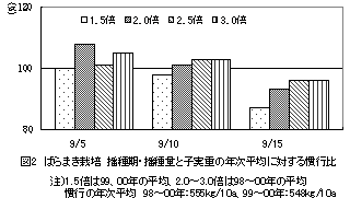 ばらまきより小さい。播種は9月20日前後とし、播種量は標準の1.5倍である383粒/㎡とする。播種時に