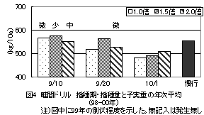 5)畦間ドリルの栽培法:1998年〜2000年、播種期・播種量を組み合わせ分割区法3反復で実施
